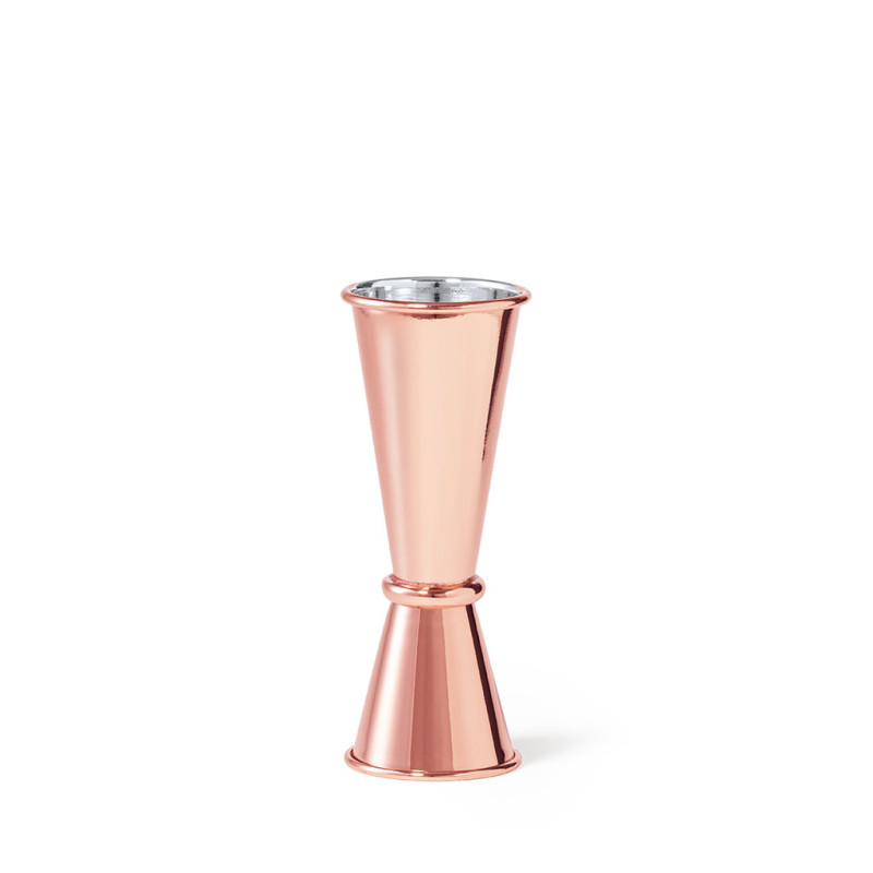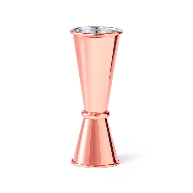 Medidor de bebidas feito em aço inoxidável com revestimento exterior de cobre galvanizado. 2 doseadores: simples 25ml e duplo 50ml. Apresentado numa atrativa caixa de design individual.