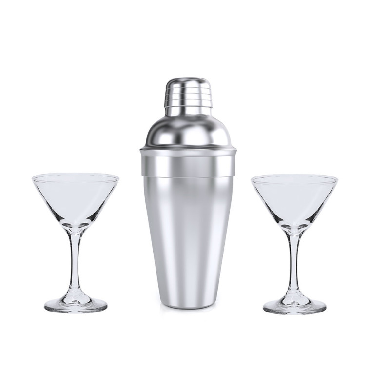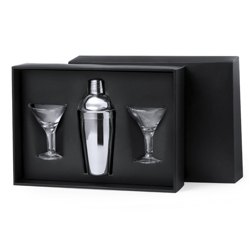 Elegante set de cocktail. Conjunto de shaker em aço inoxidável de 550 ml para preparar as melhores misturas de bebidas. Além de que, contém 2 copos de vidro de 150 ml cada um e de elegante design triangular, para uma apresentação requintada. Apresentado numa caixa preta.