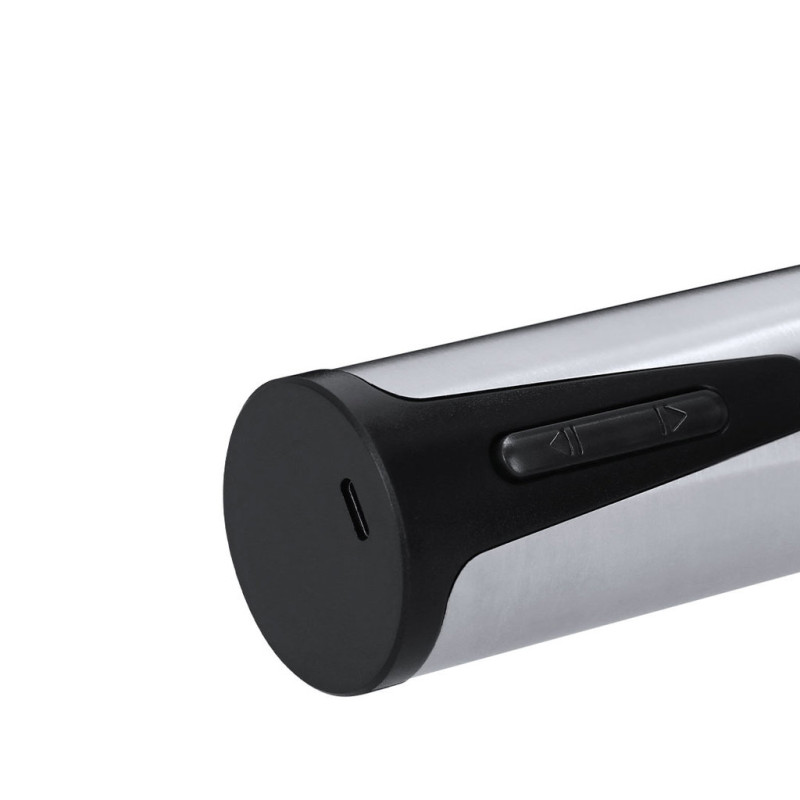 Saca-rolhas elétricas feitas de aço inoxidável e ABS. Tem um botão indicador de extração e um ejetor de rolha. Com indicadores luminosos durante o carregamento e a utilização. Bateria recarregável de 500 mAh, inclui cabo de carregamento tipo C. Um dispositivo fácil de usar e funcional.